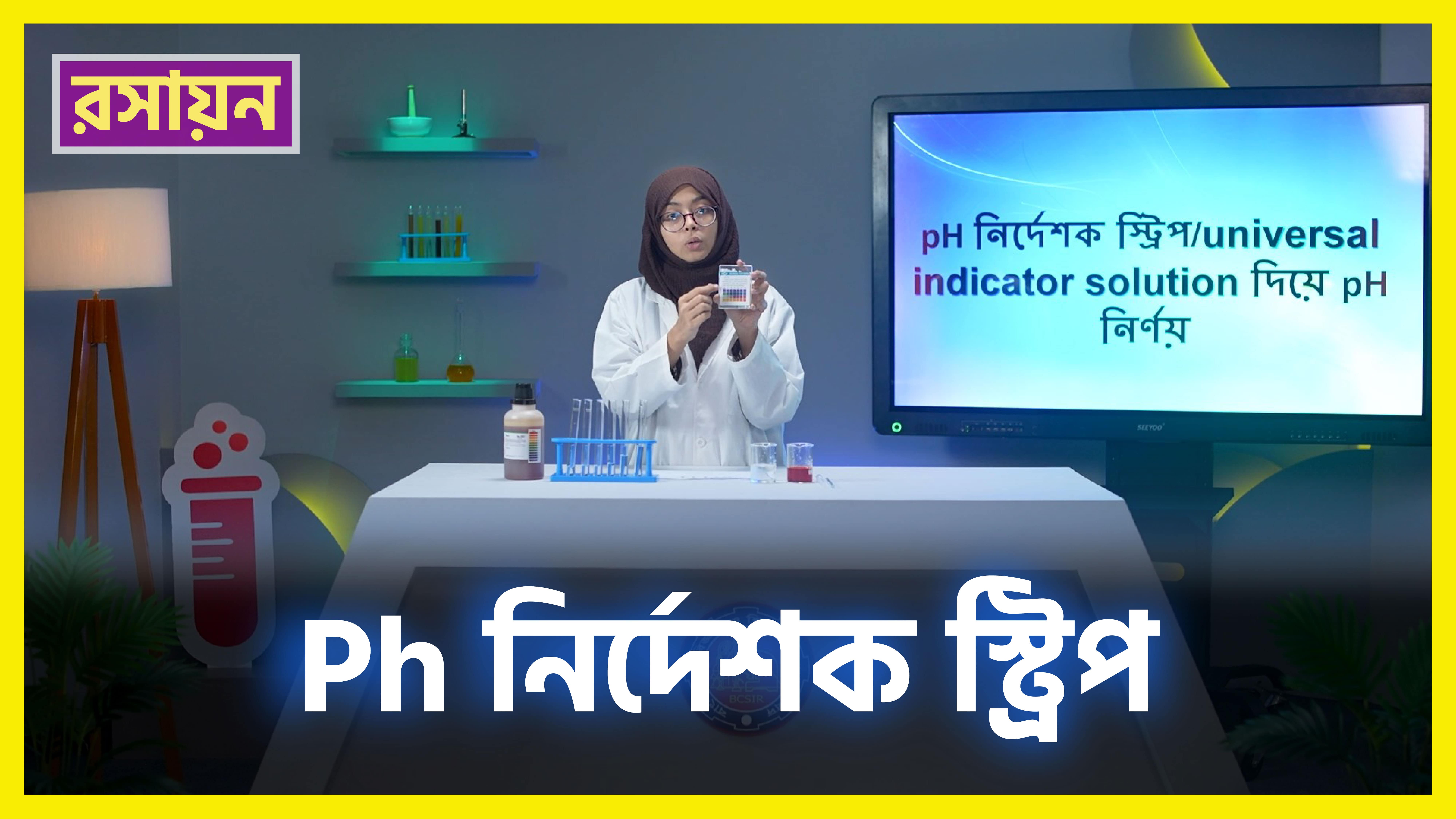pH নির্দেশক স্ট্রিপ ও সর্বজনীন নির্দেশক ব্যবহার করে দ্রবণের pH..